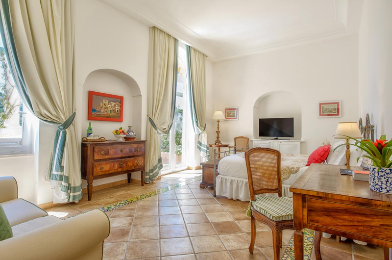 Some rooms have four-poster beds and others have a private balcony. All have fresh Mediterranean-style décor with terracotta floors. The bathrooms have marble sinks and ceramic tiles, many of them with hydromassage bathtubs.
